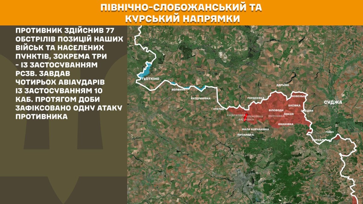 На Північно-Слобожанському і Курському напрямках минулої доби противник здійснив 77 обстрілів позицій наших військ та населених пунктів, зокрема три – із застосуванням РСЗВ. Завдав чотирьох авіаударів із застосуванням 10 КАБ. Протягом доби зафіксовано одну атаку противника.