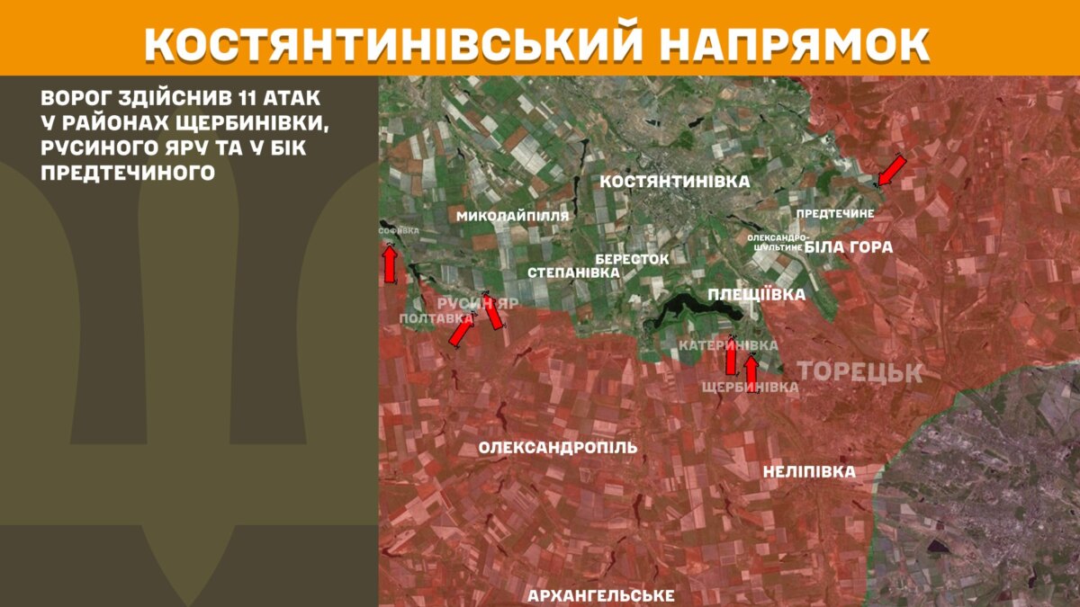 На Костянтинівському напрямку ворог здійснив 11 атак у районах Щербинівки, Русиного Яру та у бік Предтечиного.