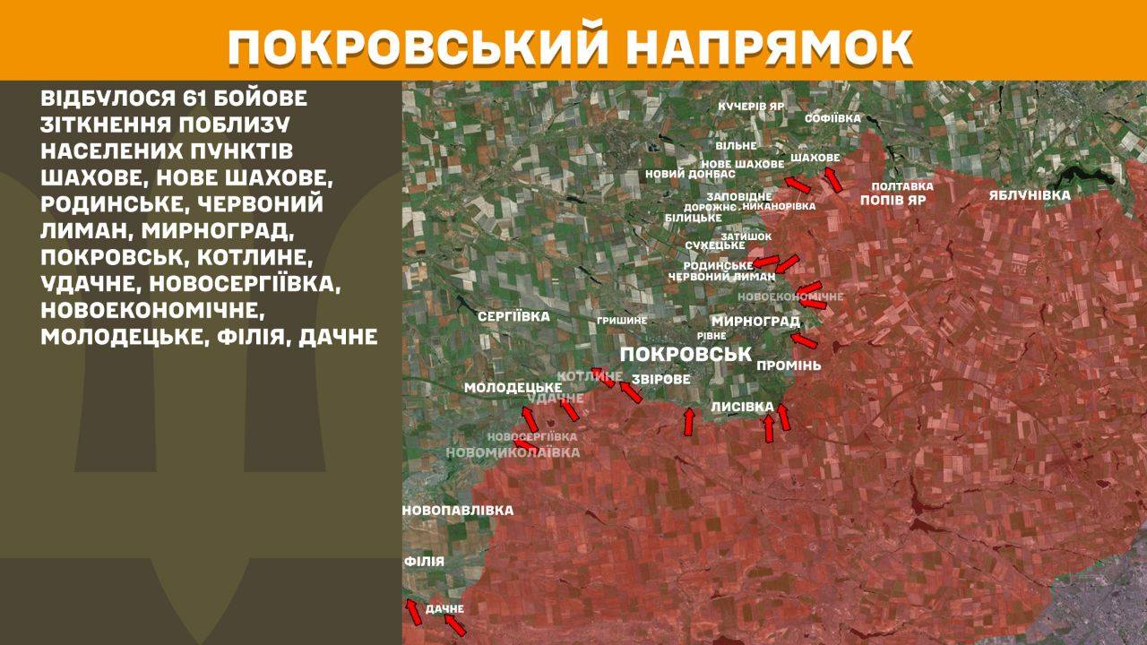На Покровському напрямку відбулося 61 бойове зіткнення поблизу населених пунктів Шахове, Нове Шахове, Родинське, Червоний Лиман, Мирноград, Покровськ, Котлине, Удачне, Новосергіївка, Новоекономічне, Молодецьке, Філія, Дачне.