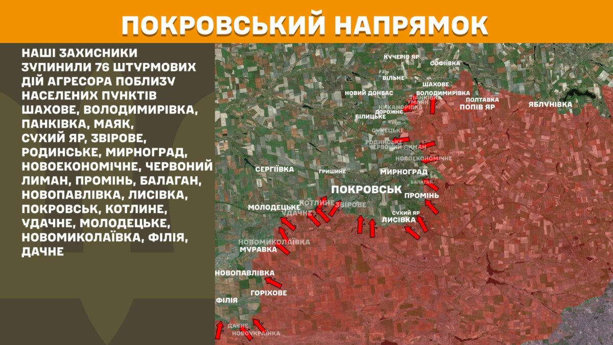 На Покровському напрямку наші захисники зупинили 76 штурмових дій агресора поблизу населених пунктів Шахове, Володимирівка, Панківка, Маяк, Сухий Яр, Звірове, Родинське, Мирноград, Новоекономічне, Червоний Лиман, Промінь, Балаган, Новопавлівка, Лисівка, Покровськ, Котлине, Удачне, Молодецьке, Новомиколаївка, Філія, Дачне.