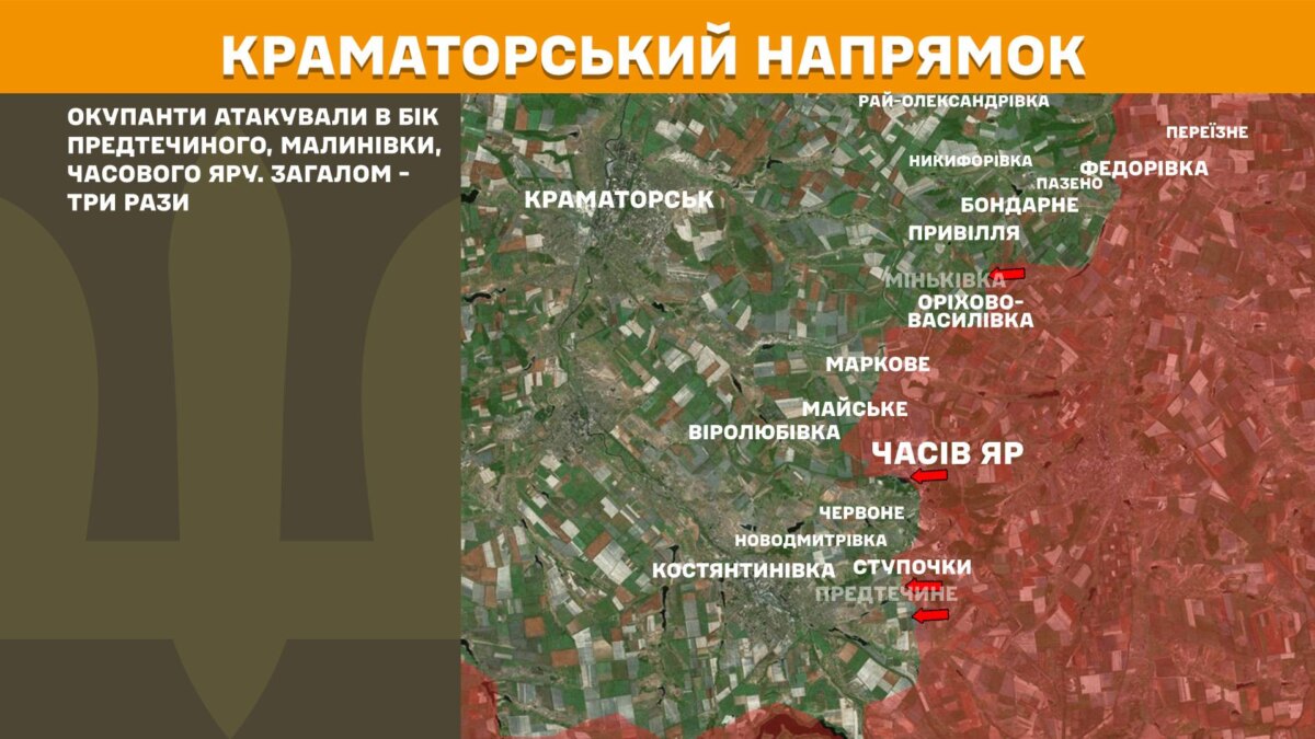 На Краматорському напрямку окупанти атакували в бік Предтечиного, Малинівки, Часового Яру. Загалом – три рази.