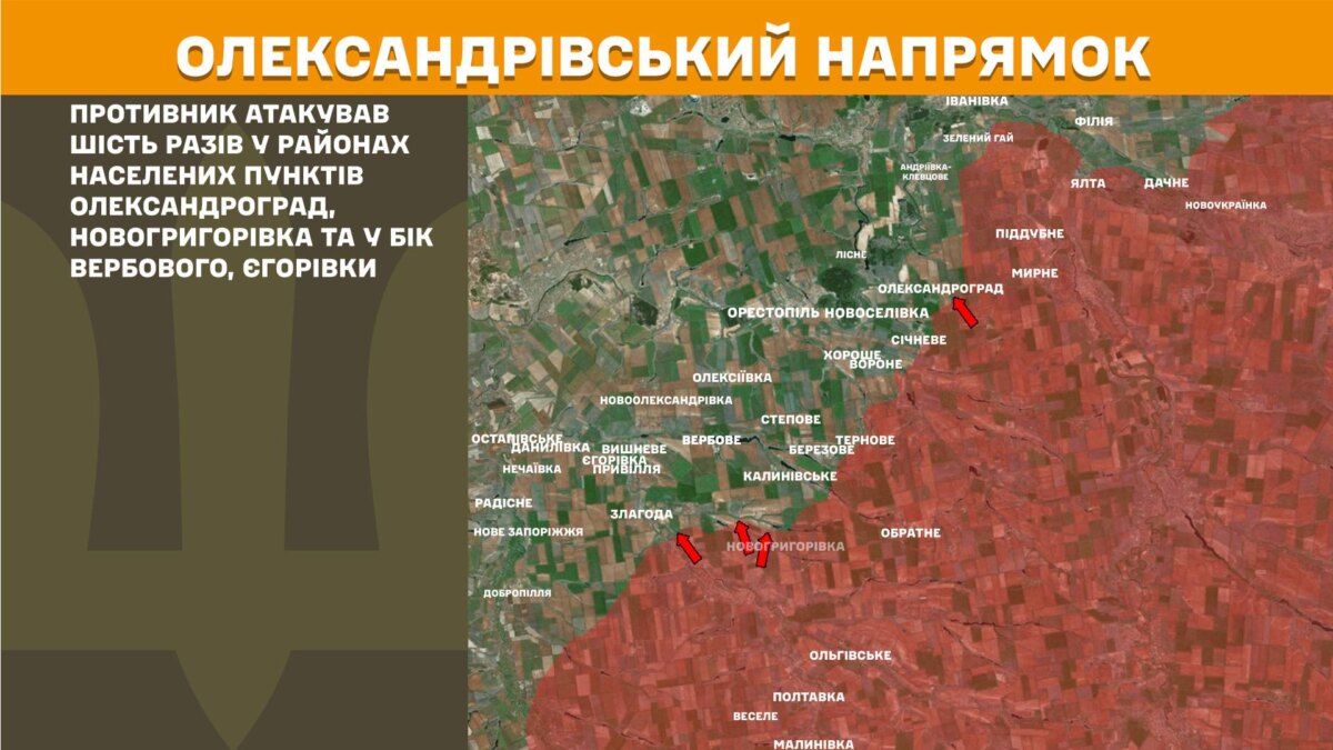 На Олександрівському напрямку противник атакував шість разів у районах населених пунктів Олександроград, Новогригорівка та у бік Вербового, Єгорівки.