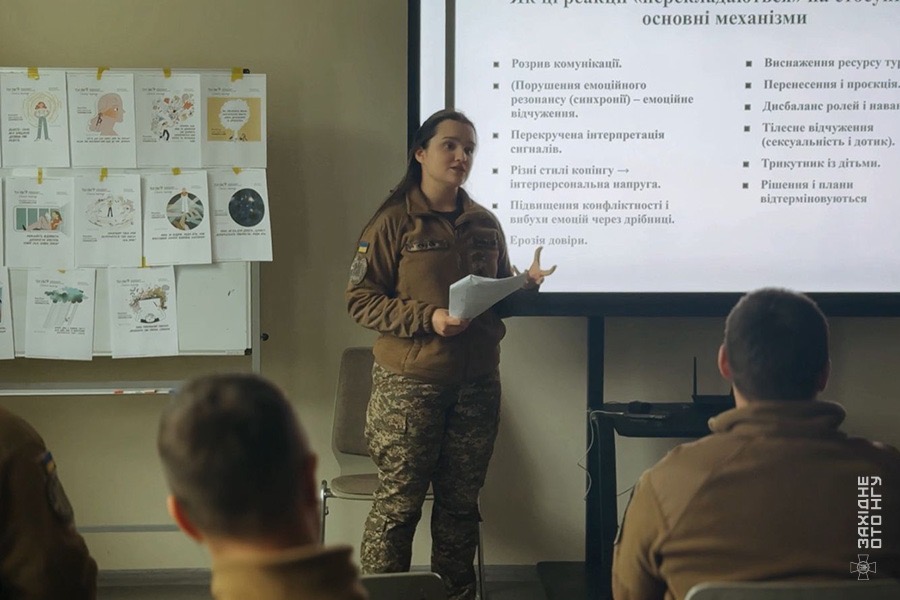 Зустрічаються військові психологи з родинами гвардійців в теплій і довірливій атмосфері. Вони спілкуються на різні теми, які турбують людей. Психолог 45 полку Національної гвардії України цього разу обговорила з гостями, як справлятися зі стресом, підтримувати близьких під час служби та знаходити сили в щоденних викликах.
