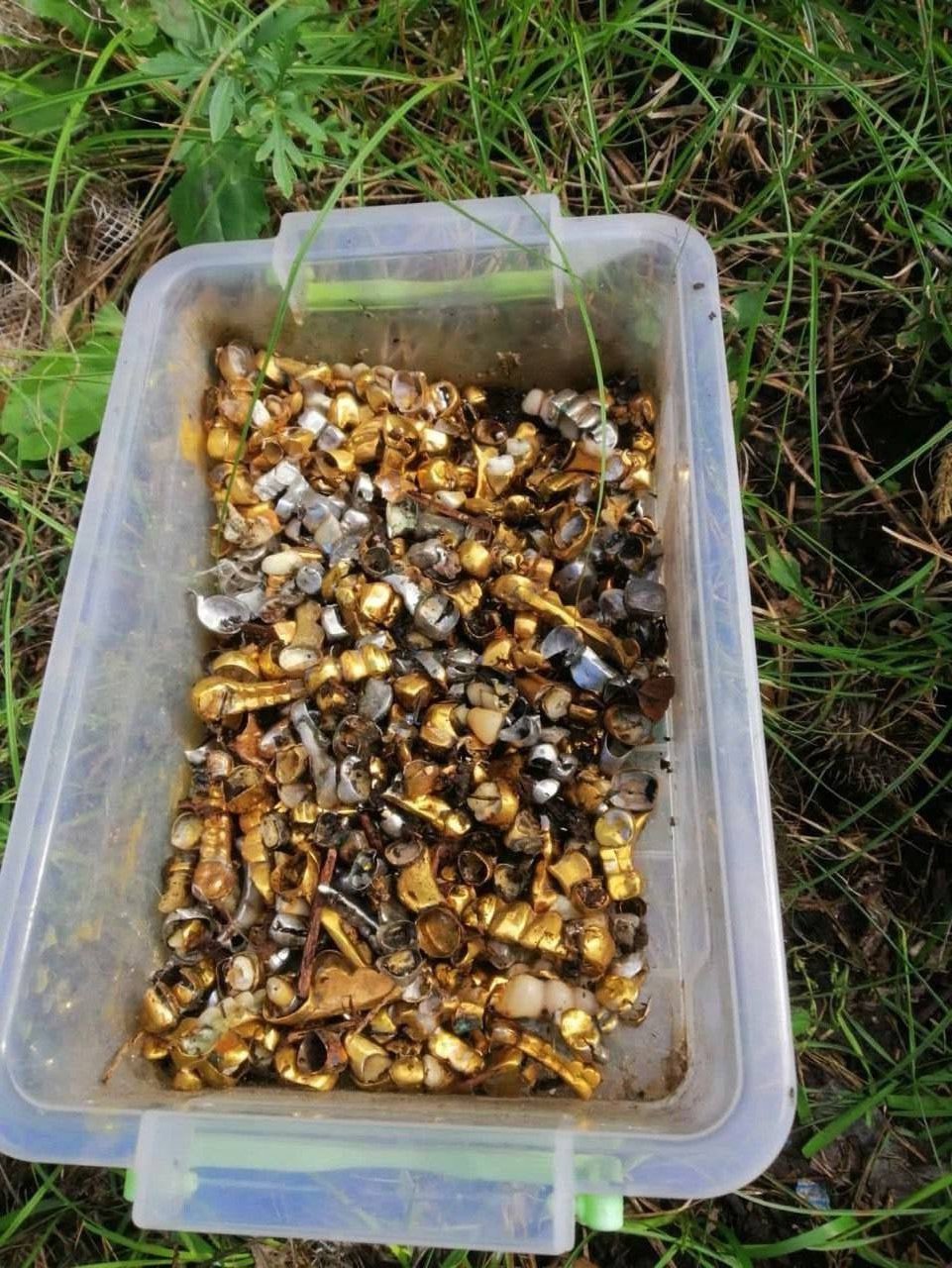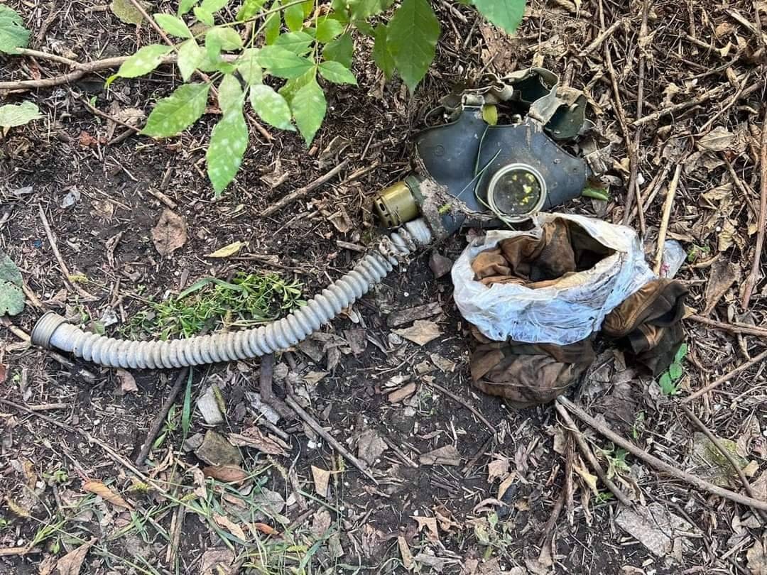Катівня в Пісках-Радьківських. 2 фотографії. Протигаз, який надягали на голову жертви, яку накривали тліючою ганчіркою і закопували живцем. І коробка (золотих – ?) зубних коронок. Міні-Аушвіц. Скільки ще знайдеться в окупованій Україні?