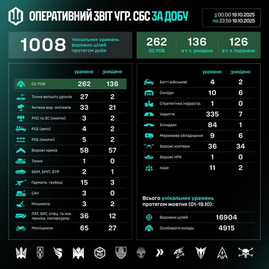 Загалом упродовж жовтня (01–19.10) знищено/уражено 16904 цілі, з них 4915 – особовий склад противника.