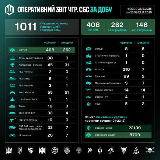 Загалом упродовж грудня (01–22.12) знищено/уражено 22109 цілей, з них 8709– особовий склад противника.
