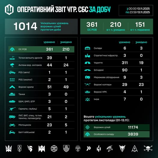 Загалом упродовж листопада (01–13.11) знищено/уражено 11174 цілей, з них 3839 – особовий склад противника.