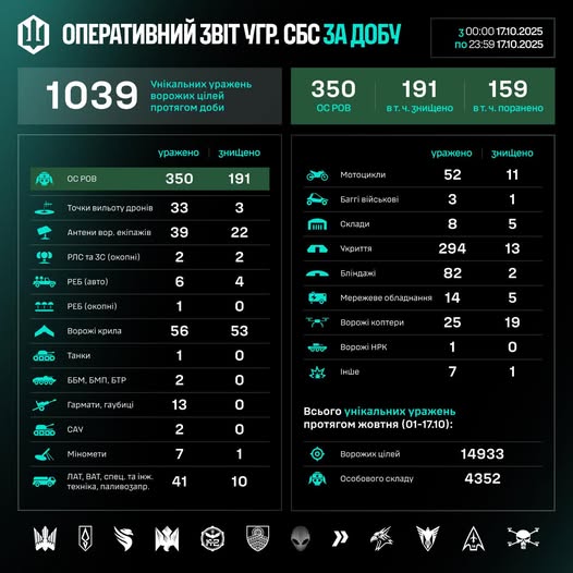 Загалом упродовж жовтня (01–17.10) знищено/уражено 14933 цілі, з них 4352 – особовий склад противника.
