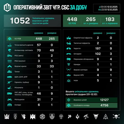 Загалом упродовж грудня (01–12.12) знищено/уражено 12127 цілей, з них 4756 – особовий склад противника.
