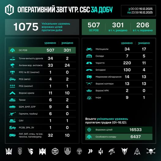 Загалом упродовж грудня (01–16.12) знищено/уражено 16533 цілей, з них 6437 – особовий склад противника.