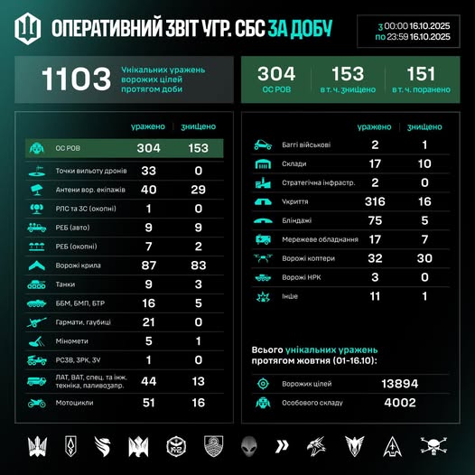Загалом упродовж жовтня (01–16.10) знищено/уражено 13894 цілі, з них 4002 – особовий склад противника.