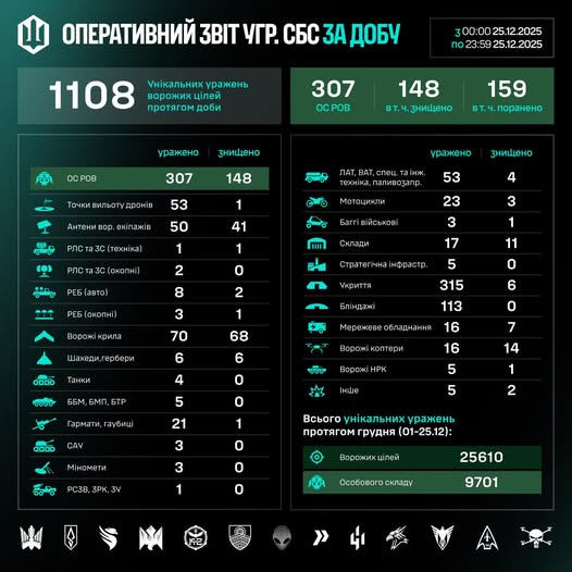 Загалом упродовж грудня (01–25.12) знищено/уражено 25610 цілей, з них – 9701 особовий склад противника.