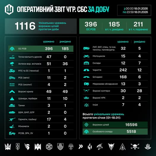 Загалом упродовж січня (01–18.01) знищено/уражено 16596 цілей, з них – 5518 особовий склад противника.