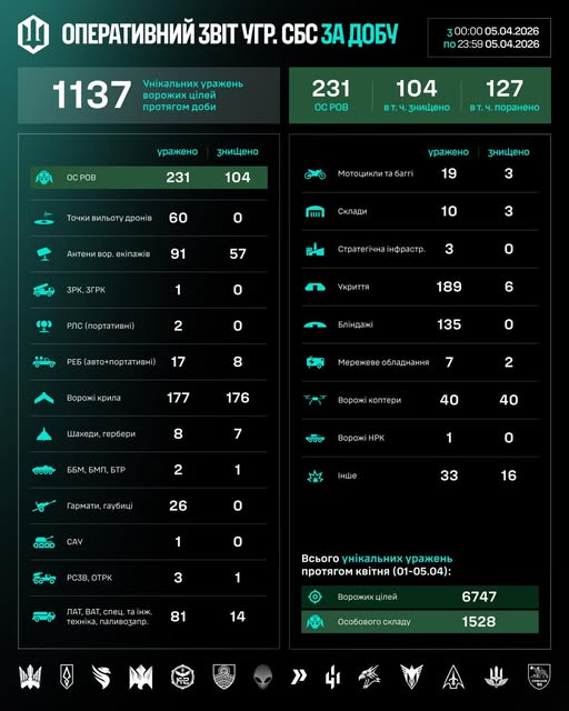 З початку квітня (01–05.04) підрозділами СБС уражено 6747 цілей противника, з них 1528 — особовий склад.