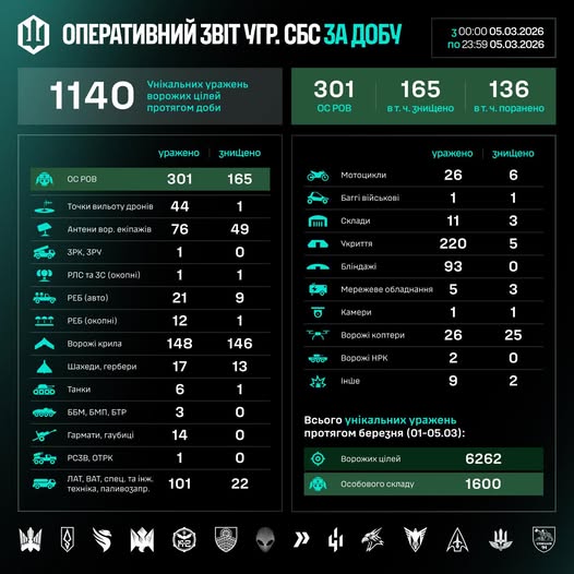 Загалом упродовж березня (01–05.03) знищено/уражено 6262 цілі, з них – 1600 осіб особового складу противника.