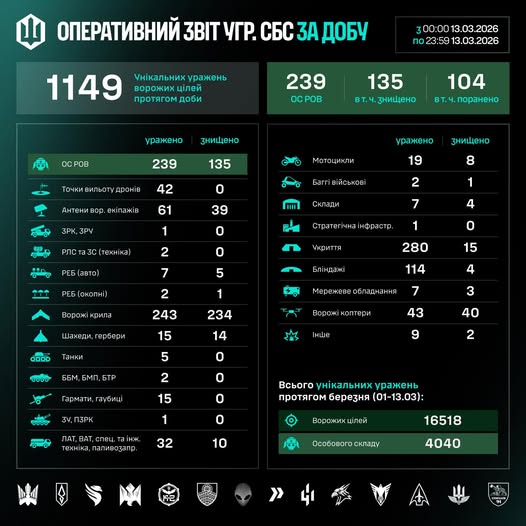 Загалом упродовж березня (01–13.03) знищено/уражено 16518 цілей, з них – 4040 особовий склад противника.