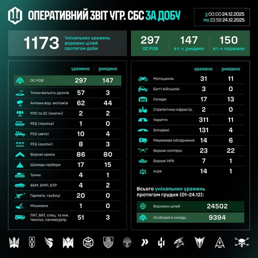 Загалом упродовж грудня (01–24.12) знищено/уражено 24502 цілі, з них – 9394 особовий склад противника.
