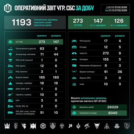 Загалом упродовж лютого (01–27.02) знищено/уражено 26029 цілей, з них – 8340 особовий склад противника.