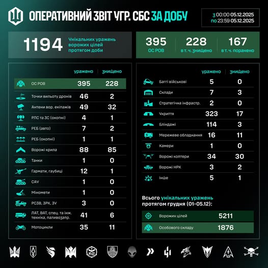 Загалом упродовж грудня (01–05.12) знищено/уражено 5211 цілей, з них 1876 – особовий склад противника.
