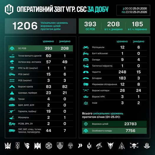 Загалом упродовж січня (01–25.01) знищено/уражено 23783 цілей, з них – 7756 особовий склад противника.