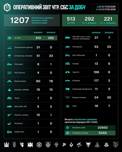 Загалом упродовж березня (01–17.03) знищено/уражено 20692 цілі, з них – 5340 особовий склад противника.