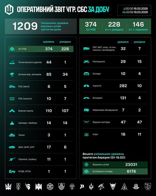 Загалом упродовж березня (01–19.03) знищено/уражено 23031 ціль, з них – 6176 особовий склад противника.