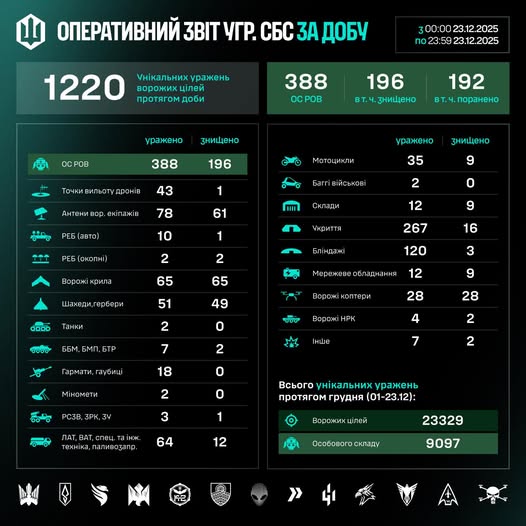 Загалом упродовж грудня (01–23.12) знищено/уражено 23329 цілей, з них 9097 – особовий склад противника.
