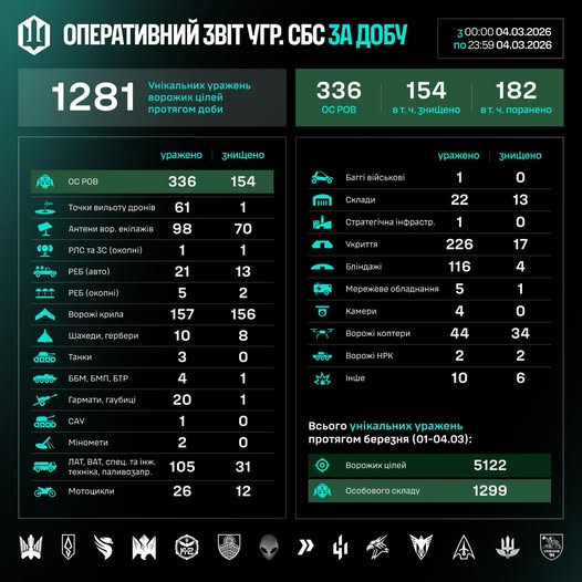 Загалом упродовж березня (01–04.03) уражено/знищено 5122 цілі, з них — 1299 особовий склад противника.