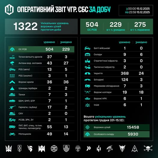 Загалом упродовж грудня (01–15.12) знищено/уражено 15458 цілей, з них 5930 – особовий склад противника.
