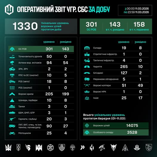 Загалом упродовж березня (01–11.03) знищено/уражено 14075 цілей, з них – 3528 особовий склад противника.