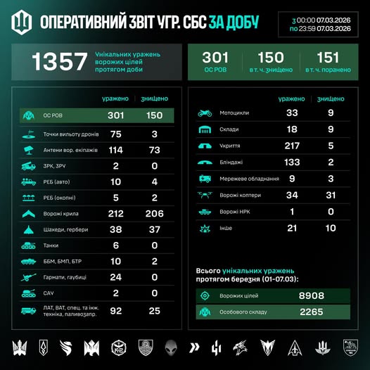 Загалом упродовж березня (01–07.03) знищено/уражено 8908 цілей, з них – 2265 особовий склад противника.