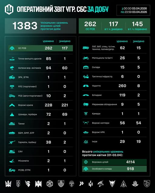 Загалом упродовж квітня (01–03.04) підрозділами СБС уражено 4114 цілі противника, з них 918 — особовий склад.
