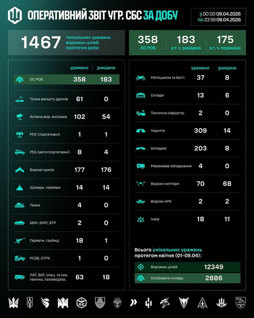 З початку квітня (01–09.04) підрозділами СБС уражено 12349 цілей противника, з них 2886 — особовий склад.