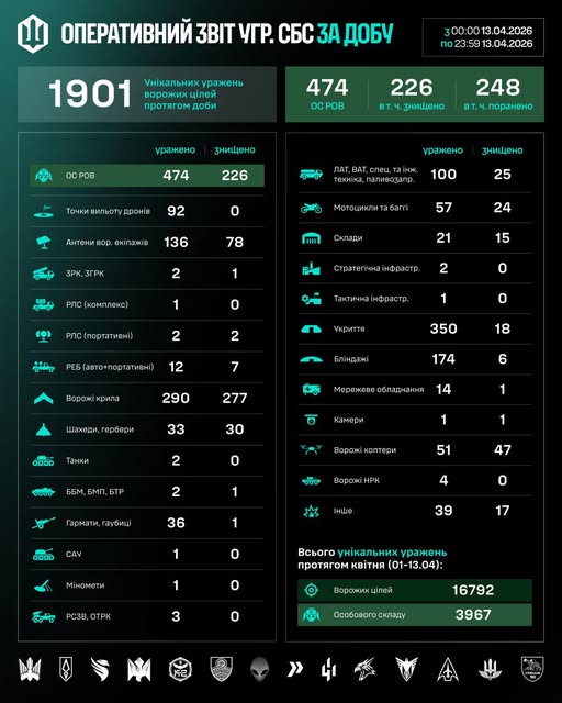 З початку квітня (01–13.04) підрозділами СБС уражено 16792 цілі противника, з них 3967 — особовий склад.