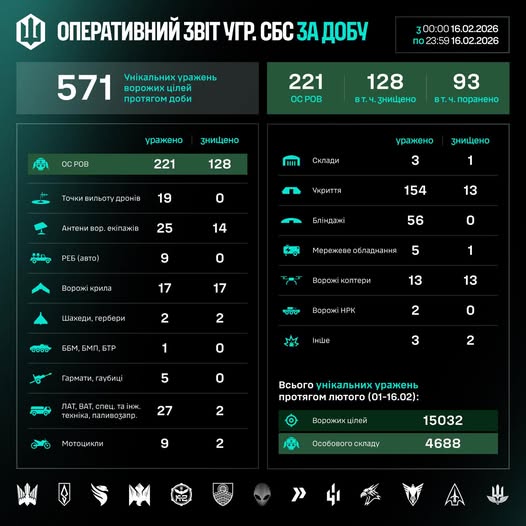 Загалом упродовж лютого (01–16.02) знищено/уражено 15032 цілі, з них – 4688 особовий склад противника.
