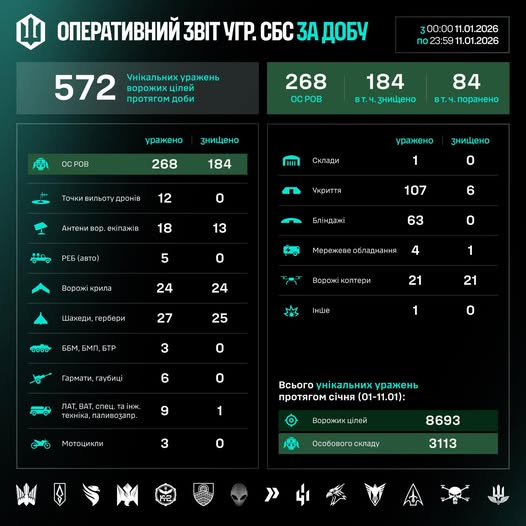 Загалом упродовж січня (01–11.01) знищено/уражено 8693 цілі, з них – 3113 особовий склад противника.