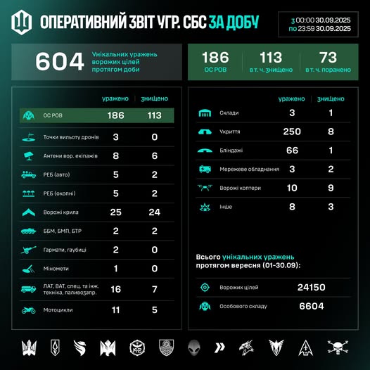 Загалом упродовж вересня (01–30.09) знищено/уражено 24150 цілей, з них 6604 – особовий склад противника.
