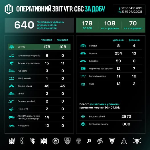 Загалом упродовж жовтня (01–04.10) знищено/уражено 2873 цілей, з них 800 – особовий склад противника.
