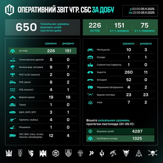 Загалом упродовж листопада (01–05.11) знищено/уражено 4287 цілей, з них 1325 – особовий склад противника.