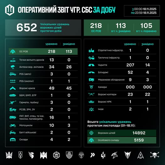 Загалом упродовж листопада (01–18.11) знищено/уражено 14892 цілі, з них 5159 – особовий склад противника.