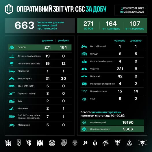 Загалом упродовж листопада (01–20.11) знищено/уражено 16190 цілей, з них 5666 – особовий склад противника.