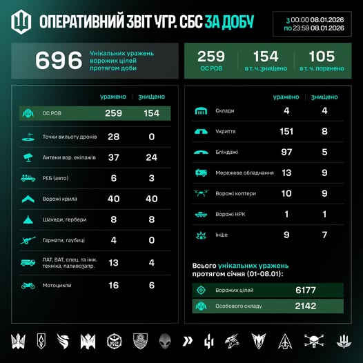 Загалом упродовж січня (01–08.01) знищено/уражено 6177 цілей, з них – 2142 особовий склад противника.