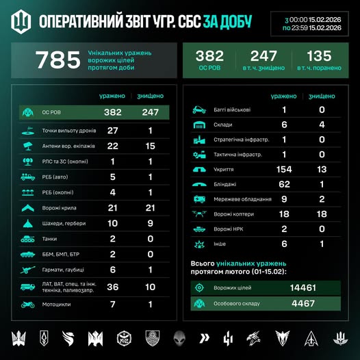 Загалом упродовж лютого (01–15.02) знищено/уражено 14461 ціль, з них – 4467 особовий склад противника.