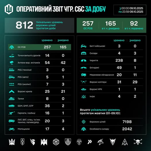 Загалом упродовж жовтня (01–09.10) знищено/уражено 7198 цілей, з них 2042 – особовий склад противника.