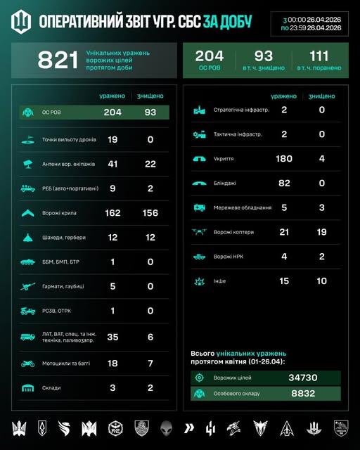 З початку квітня (01–26.04) підрозділами СБС уражено 34730 цілей противника, з них 8832 — особовий склад.