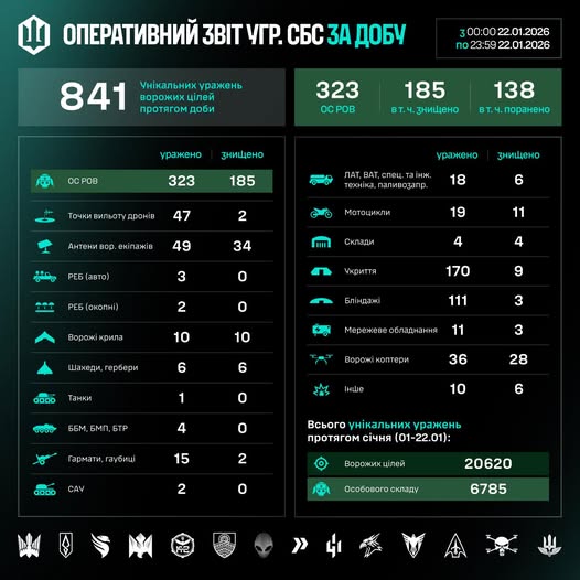 Загалом упродовж січня (01–22.01) знищено/уражено 20620 цілей, з них – 6785 особовий склад противника.