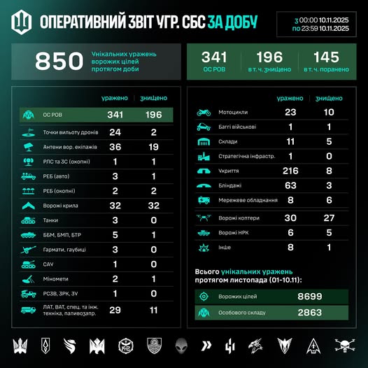 Загалом упродовж листопада (01–10.11) знищено/уражено 8699 цілей, з них 2863 – особовий склад противника.