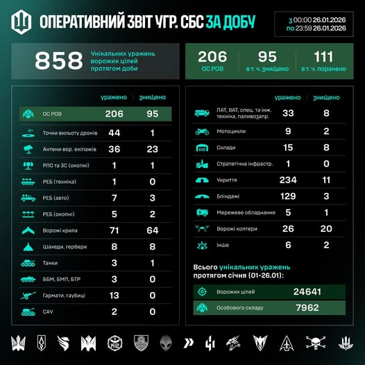 Загалом упродовж січня (01–26.01) знищено/уражено 24641 ціль, з них – 7962 особовий склад противника.