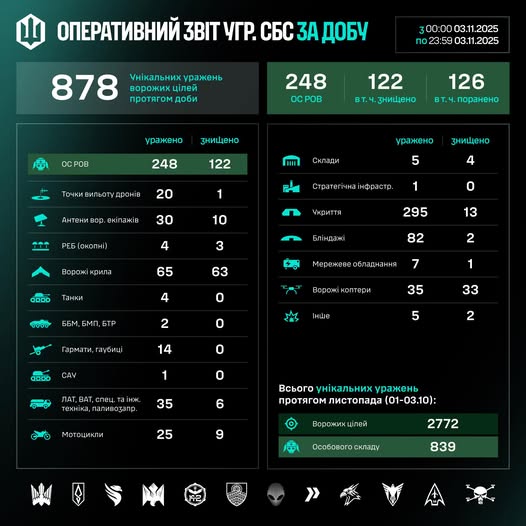 Загалом упродовж листопада (01–03.11) знищено/уражено 2772 цілі, з них 839 – особовий склад противника.
