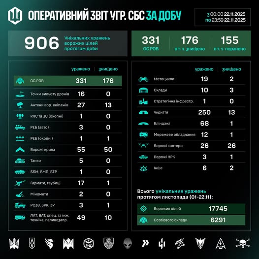 Загалом упродовж листопада (01–22.11) знищено/уражено 17745 цілей, з них 6291 – особовий склад противника.